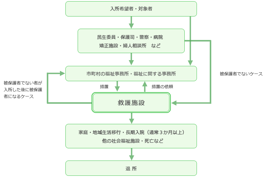 原則として居住地を管轄する福祉事務所に対して、本人か、またはその扶養義務者等が申請し、保護実施機関(都道府県知事、市長及び福祉事務所を設置する町村長)による「措置」により入所が決まります。