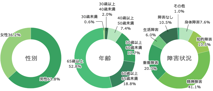 身体障害・知的障害・精神障害といった障害の種類による対象者の限定はありません。実際に、救護施設には、身体障害のある人(視覚障害、聴覚障害、肢体不自由、等)、知的障害のある人、精神障害のある人、それらの障害を重複して持つ人、アルコール依存症の人、ホームレスの人など、多様で複合的な課題を持つ人々が生活しています。