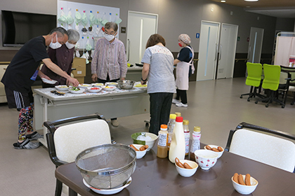 日々の食事だけではなく、自立支援においても食事は大切なウェイトを占めますので、少人数グループごとの調理実習を企画し、地域での生活に向けたお手伝いをしています。