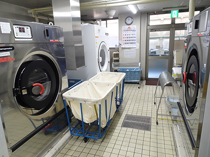当館のクリーニング部では、クリーニング師やクリーニング従事者講習を受講した支援員が常駐し、部員である利用者たちが適切に作業できるよう支援しています。アイロンがけや衣類のたたみ方を教えたり、大型洗濯機やプレス機のオペレーターを育成したりしています。主に施設内のシーツや利用者の衣類、作業着、カーテンなどのクリーニングを行っています。